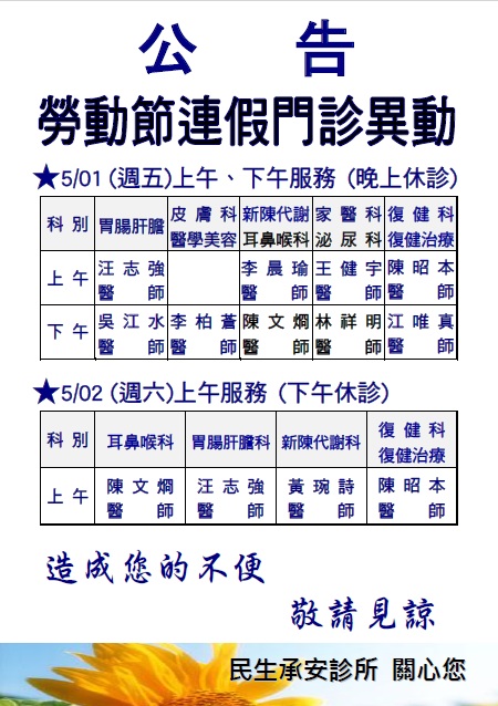 勞動節門診時間異動